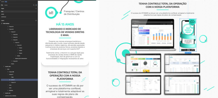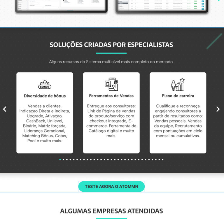 Com a proposta de ser um software poderoso para o marketing multinível, o Atommn precisava de uma página que concentrasse seus destaques em um só lugar de forma ilustrativa e demonstrativa.