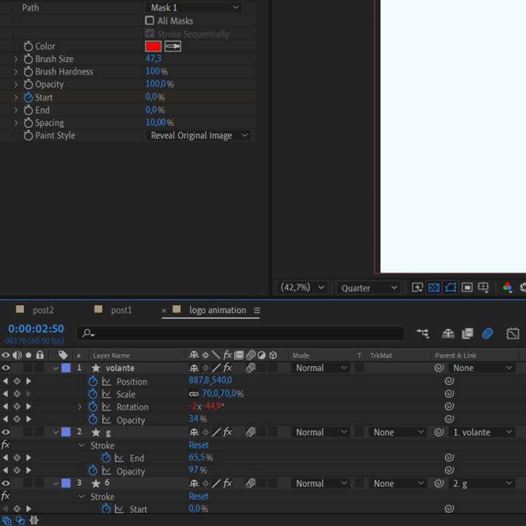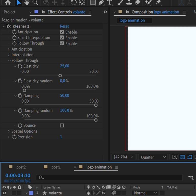 Key-frames principalmente relacionados a rotação, finalizados com suavização e follow through do plugin Duik, que facilita e acelera bastante o processo de finalização de uma animação.